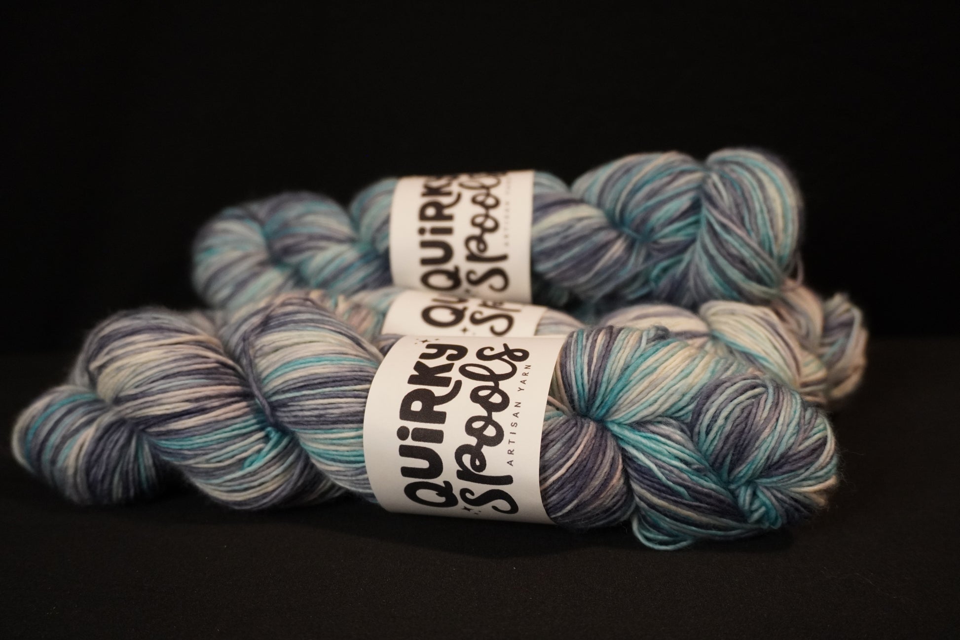 This yarn is made from 100% super fine merino super wash wool and has been carefully hand-dyed. The colorway features a beautiful blend of denim blue, grey and white. One skein is 393 yards is classified as fingering weight yarn.