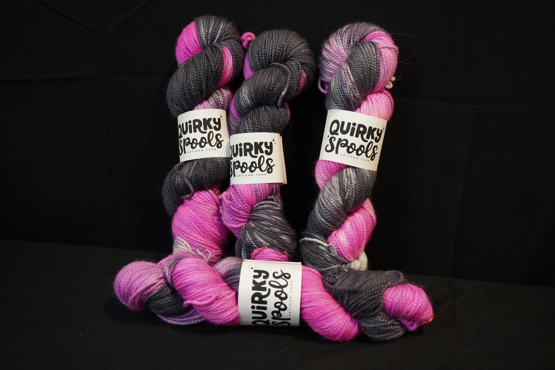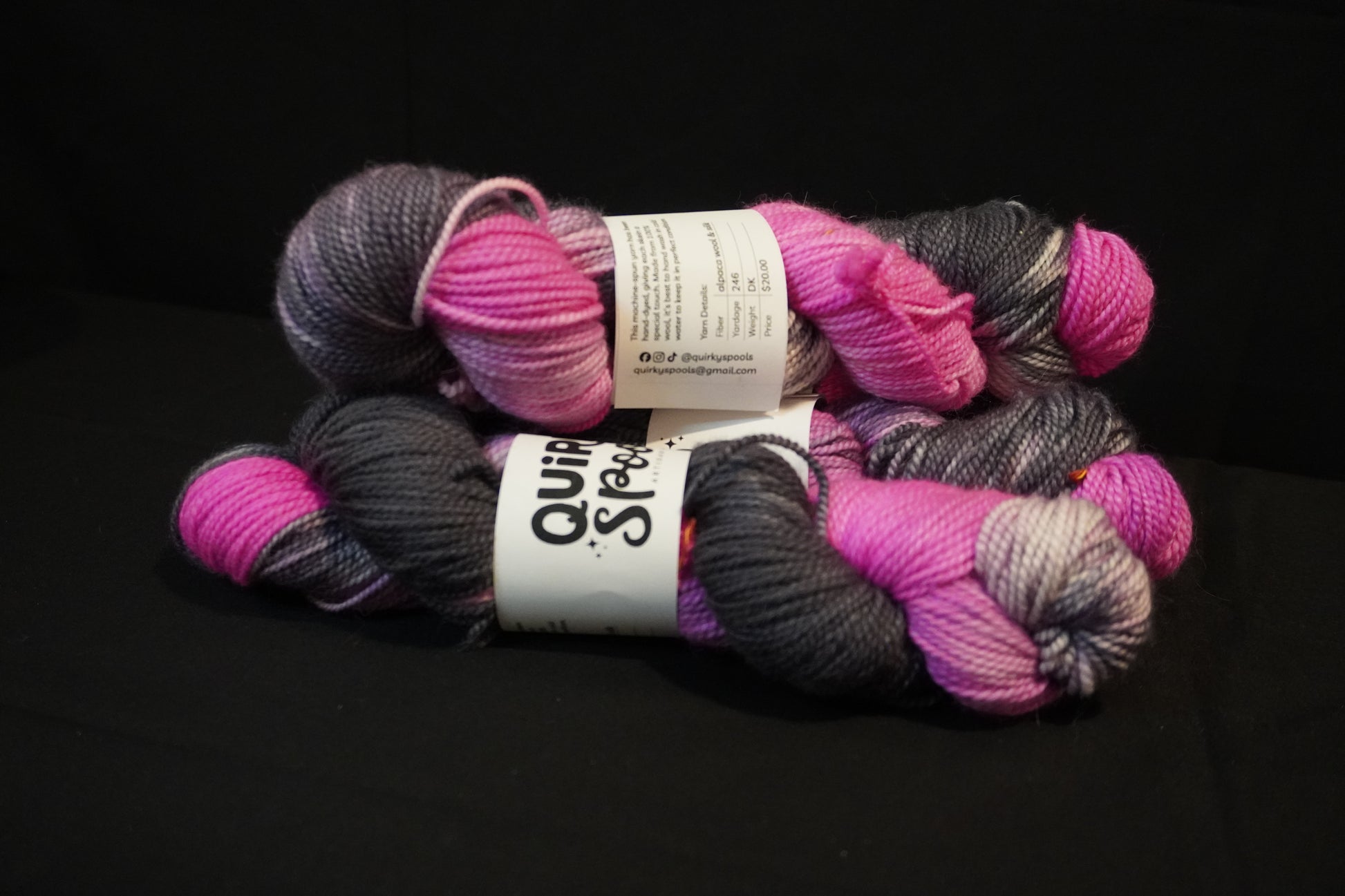 A moody romance in a skein. Deep black shadows entwined with pink and mauve highlights, like roses blooming at twilight. The silk adds a soft sheen, the alpaca brings cozy warmth, and the wool keeps everything springy and strong. Perfect for shawls, lightweight sweaters, or accessories that deserve a touch of drama.