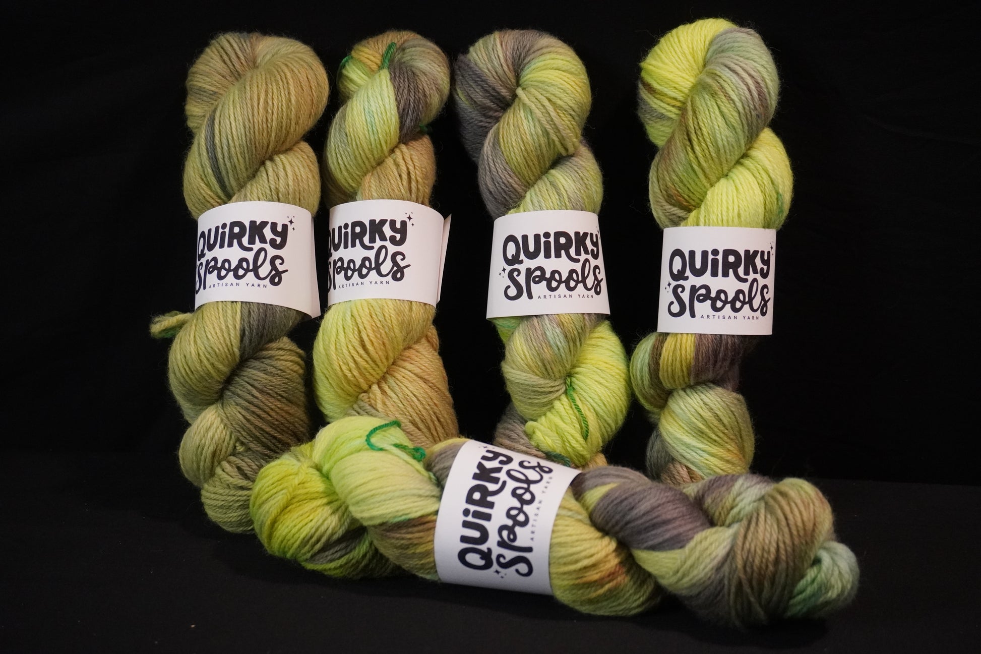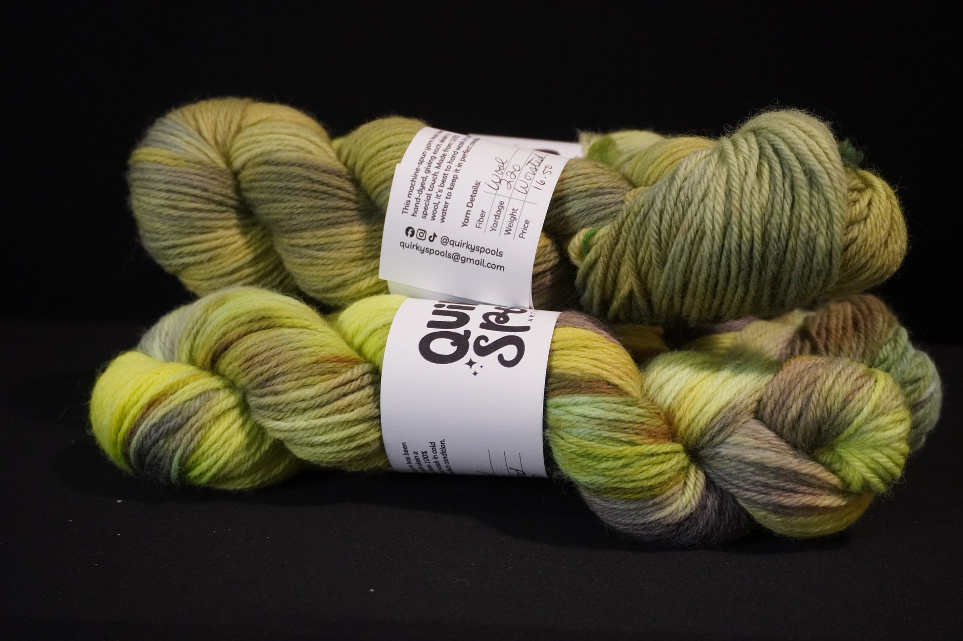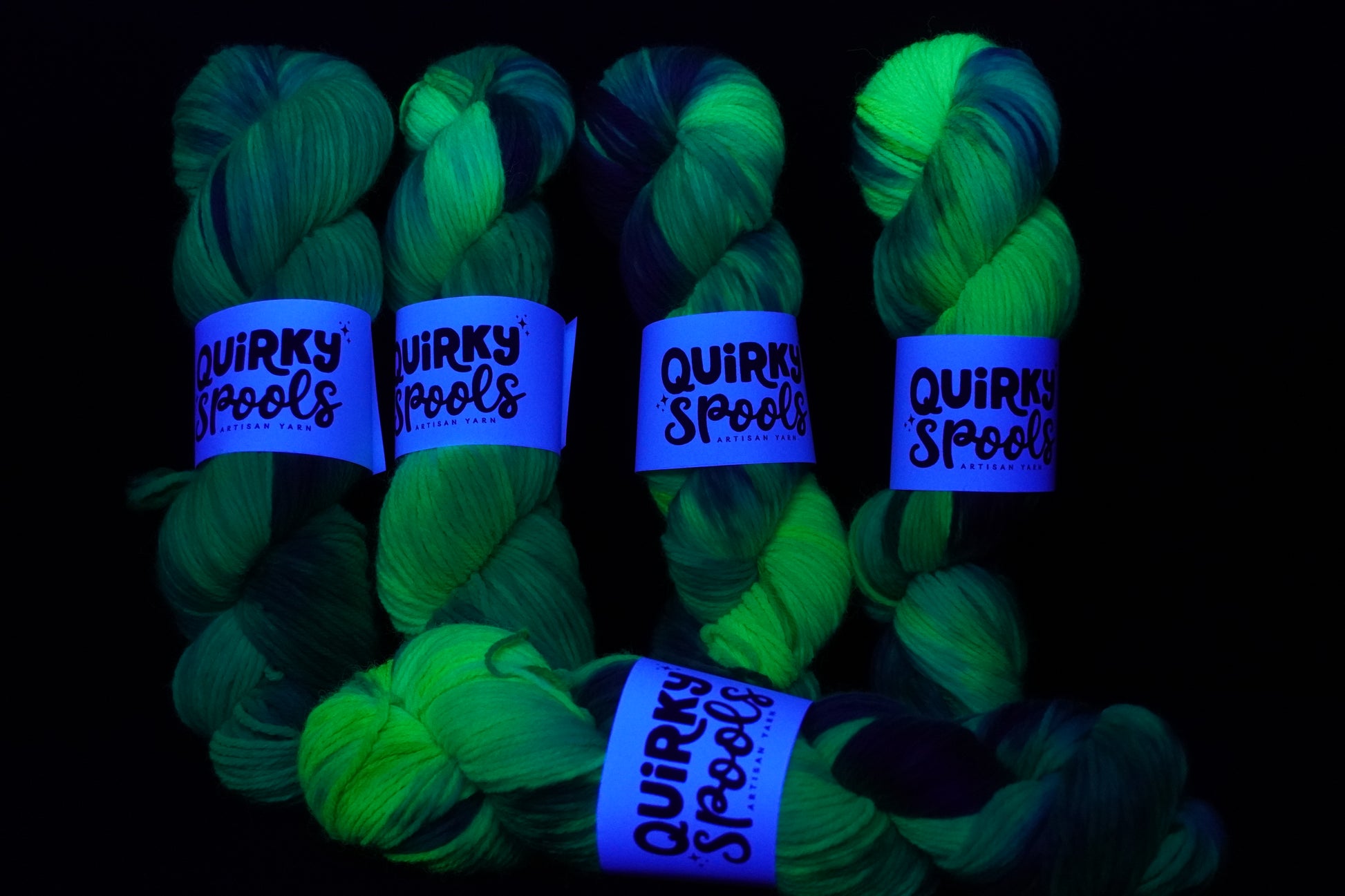 This yarn is made from 100% wool and has been carefully hand dyed. The colorway features a beautiful blend of chartreuse, brown, and a hint of black. This yarn is UV reactive, glowing under black light. Each skein contains 220 yards and is classified as worsted weight.