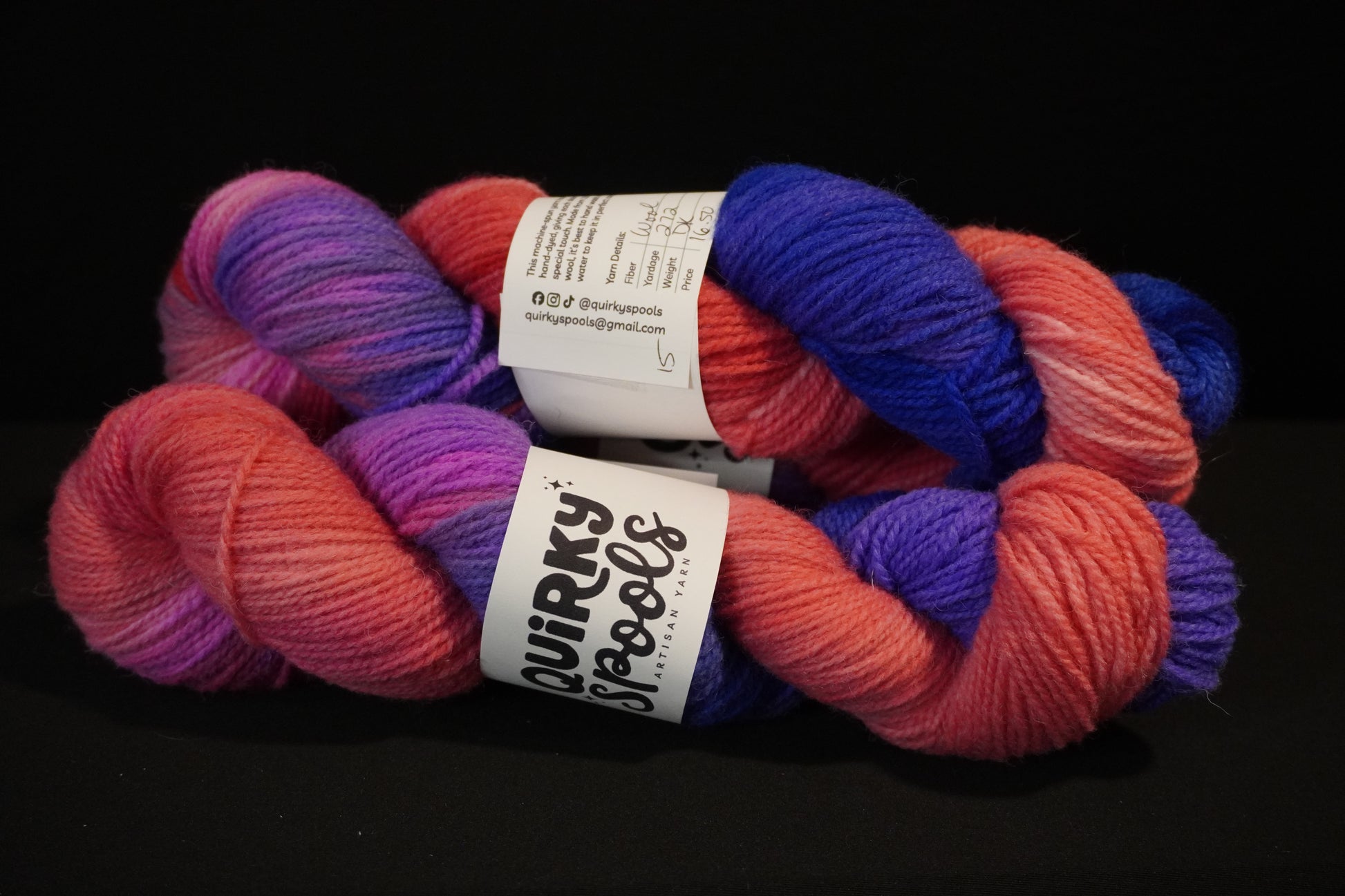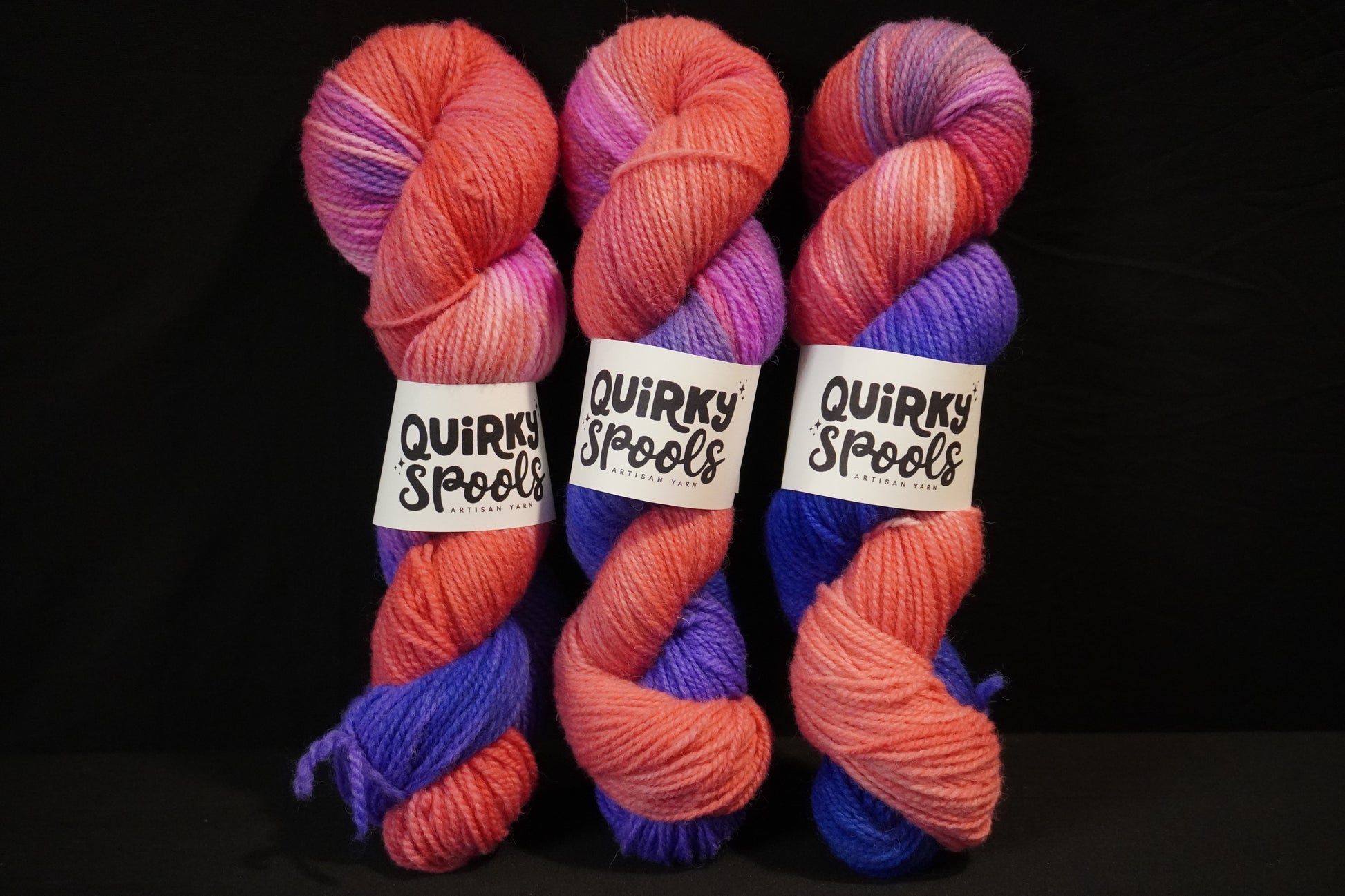 This yarn is made from 100% wool and has been carefully hand dyed. The colorway features a beautiful blend of rose, light pink, and purple. Each skein contains 272 yards and is classified as DK weight.